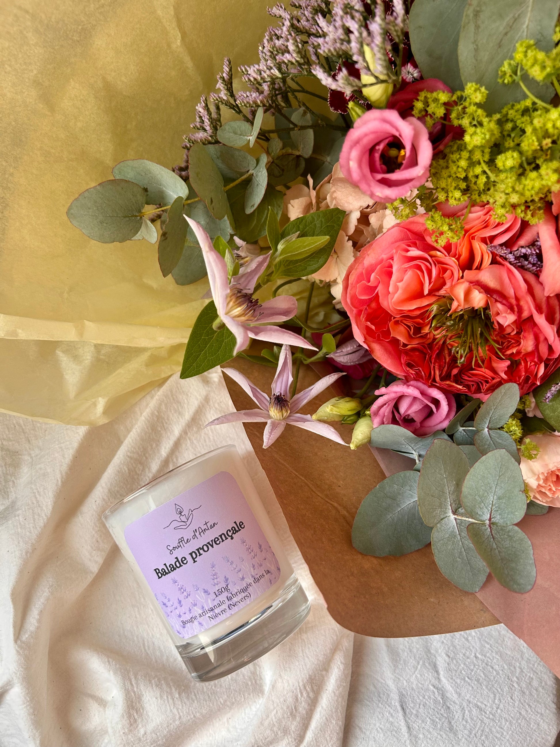 Cire de végétale 100% soja, biodégradable. Mèche en coton et fibre de lin. Parfum de Grasse sans CMR, ni phtalates. Bougie décorée de fleurs séchées.