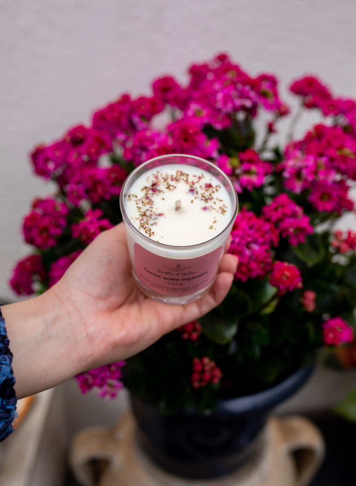 Cire de végétale 100% soja, biodégradable. Mèche en coton et fibre de lin. Parfum de Grasse sans CMR, ni phtalates. Bougie décorée de fleurs séchées.