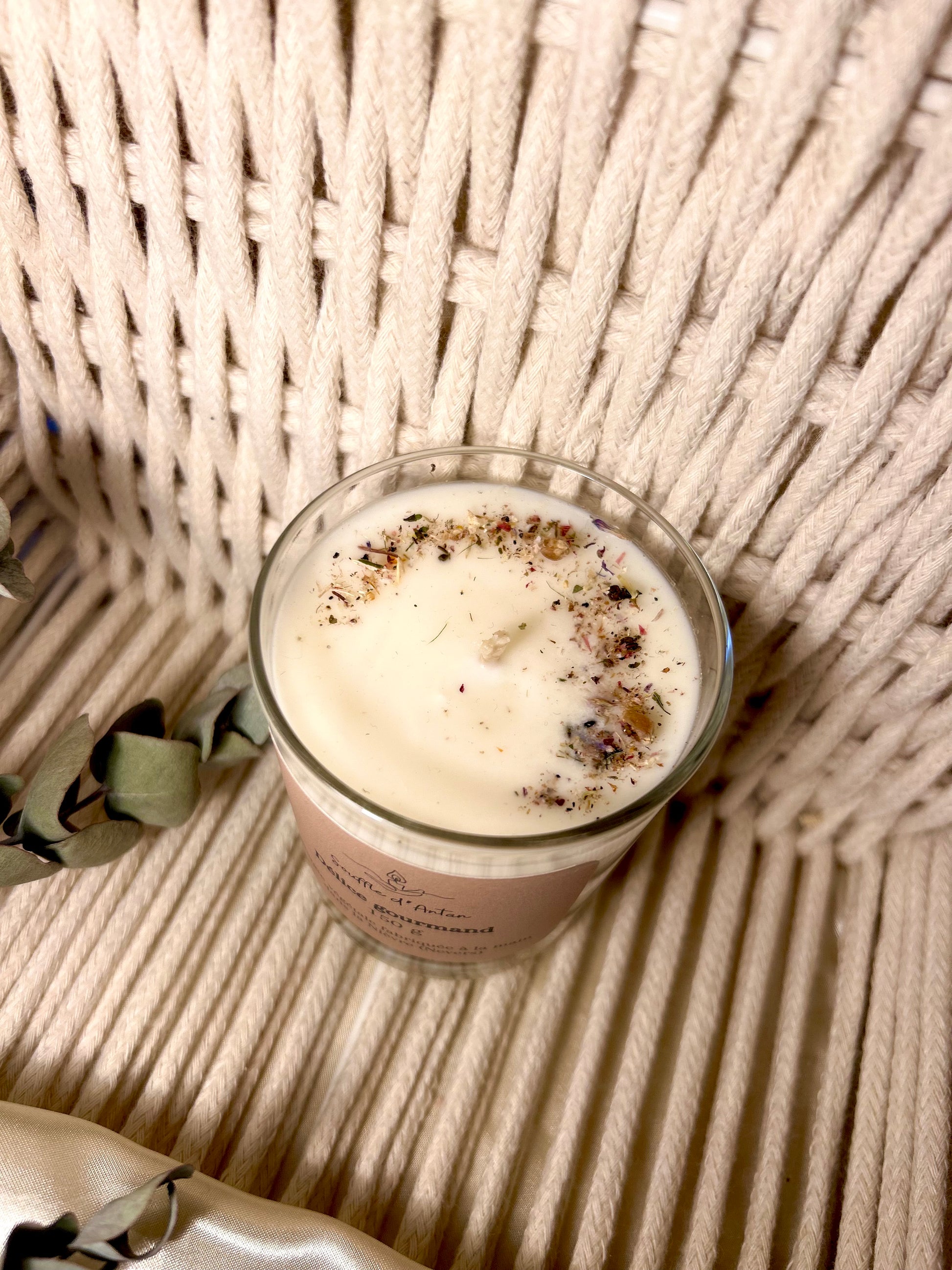 Cire de végétale 100% soja, biodégradable. Mèche en coton et fibre de lin. Parfum de Grasse sans CMR, ni phtalates. Bougie décorée de fleurs séchées.