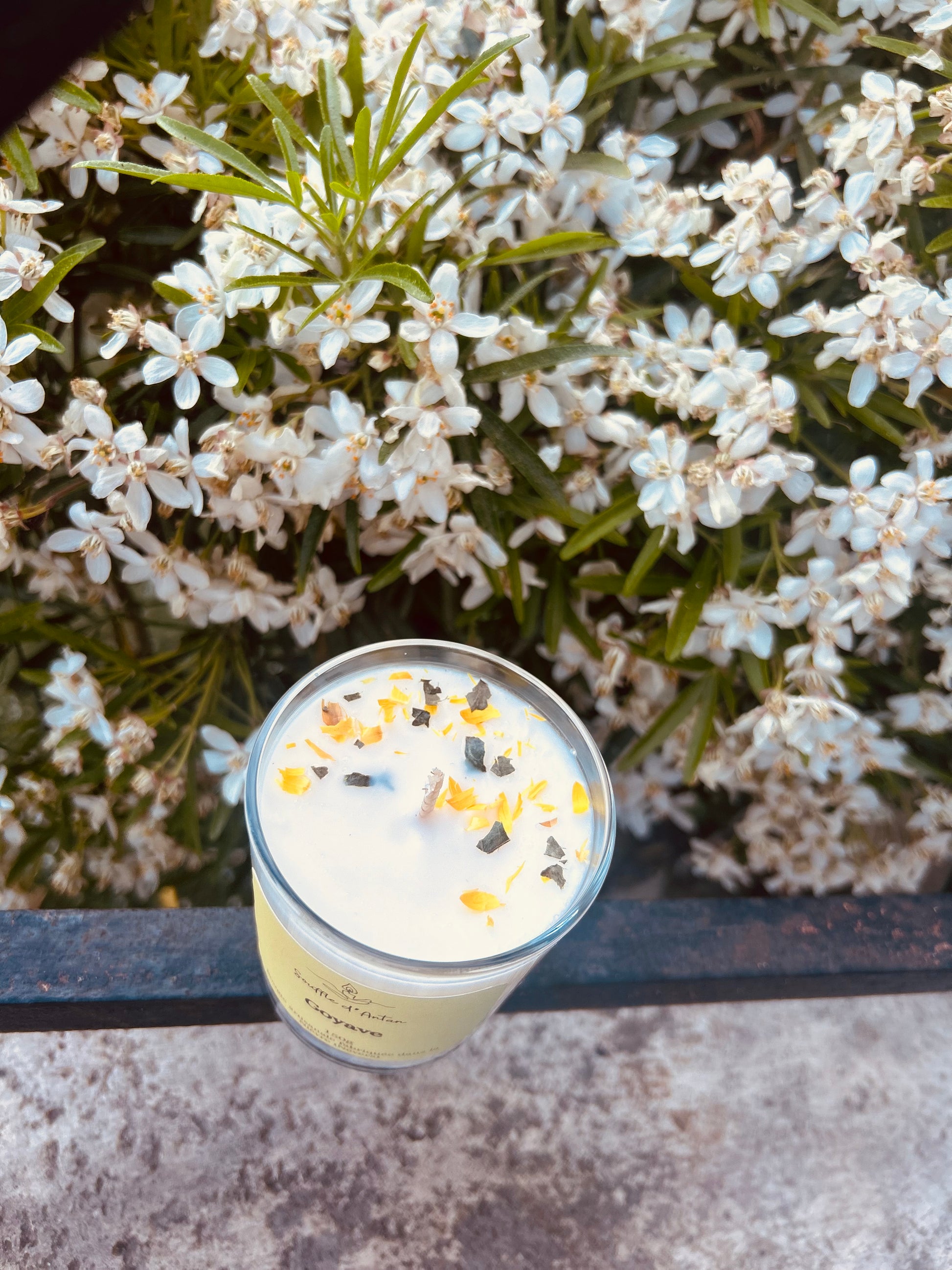 Cire de végétale 100% soja, biodégradable. Mèche en coton et fibre de lin. Parfum de Grasse sans CMR, ni phtalates. Bougie décorée de fleurs séchées.