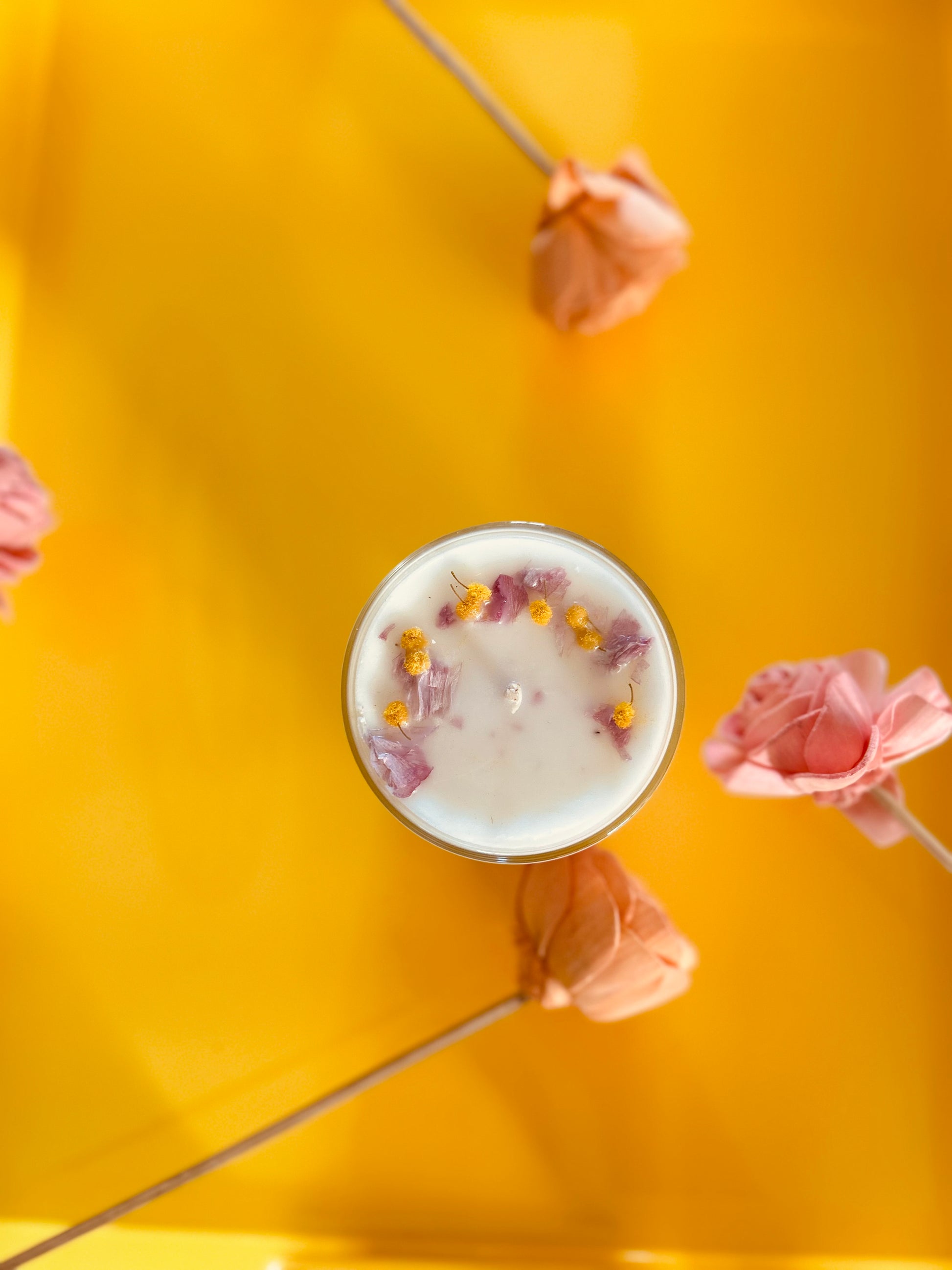 Cire de végétale 100% soja, biodégradable. Mèche en coton et fibre de lin. Parfum de Grasse sans CMR, ni phtalates. Bougie décorée de fleurs séchées.