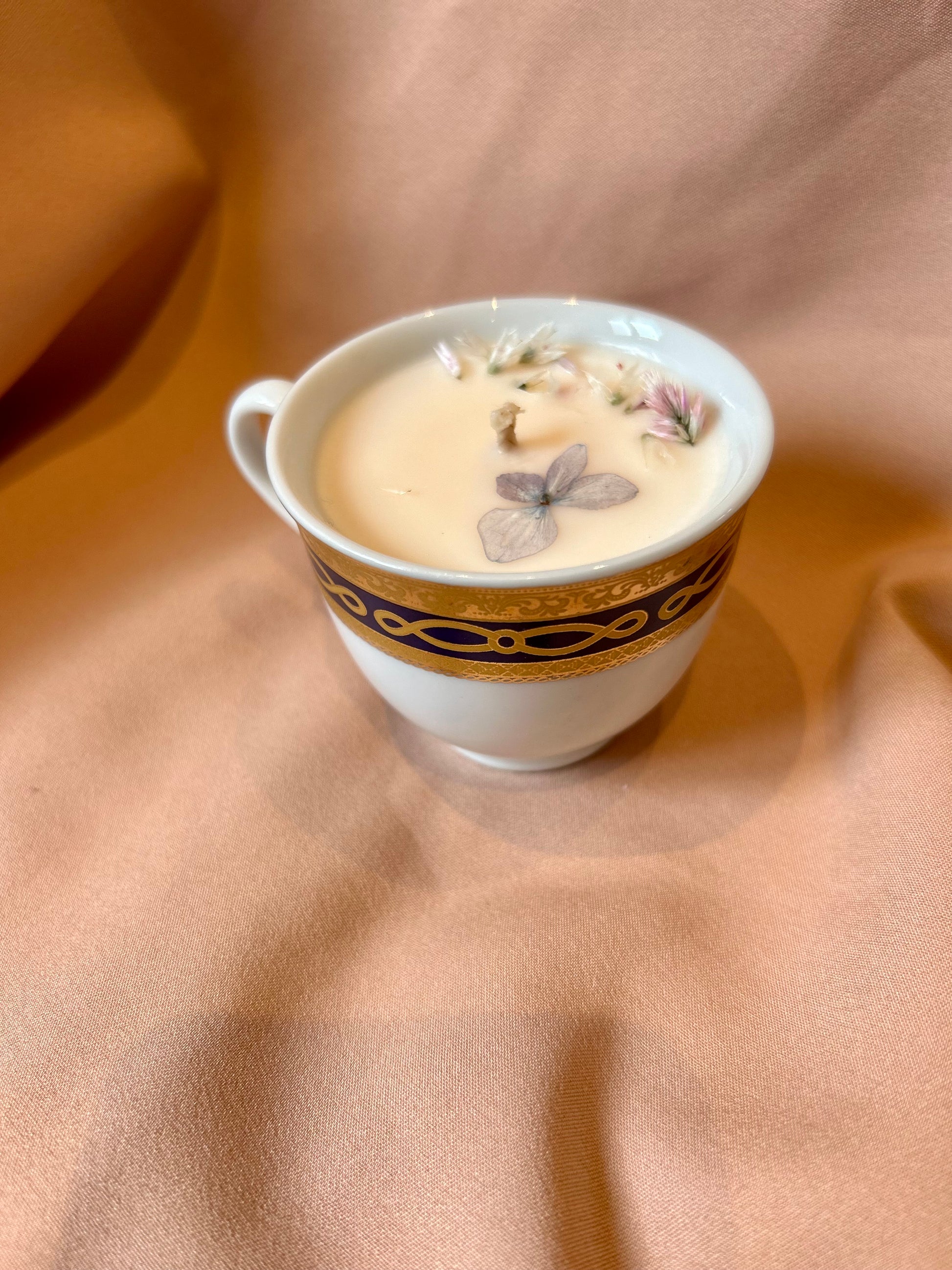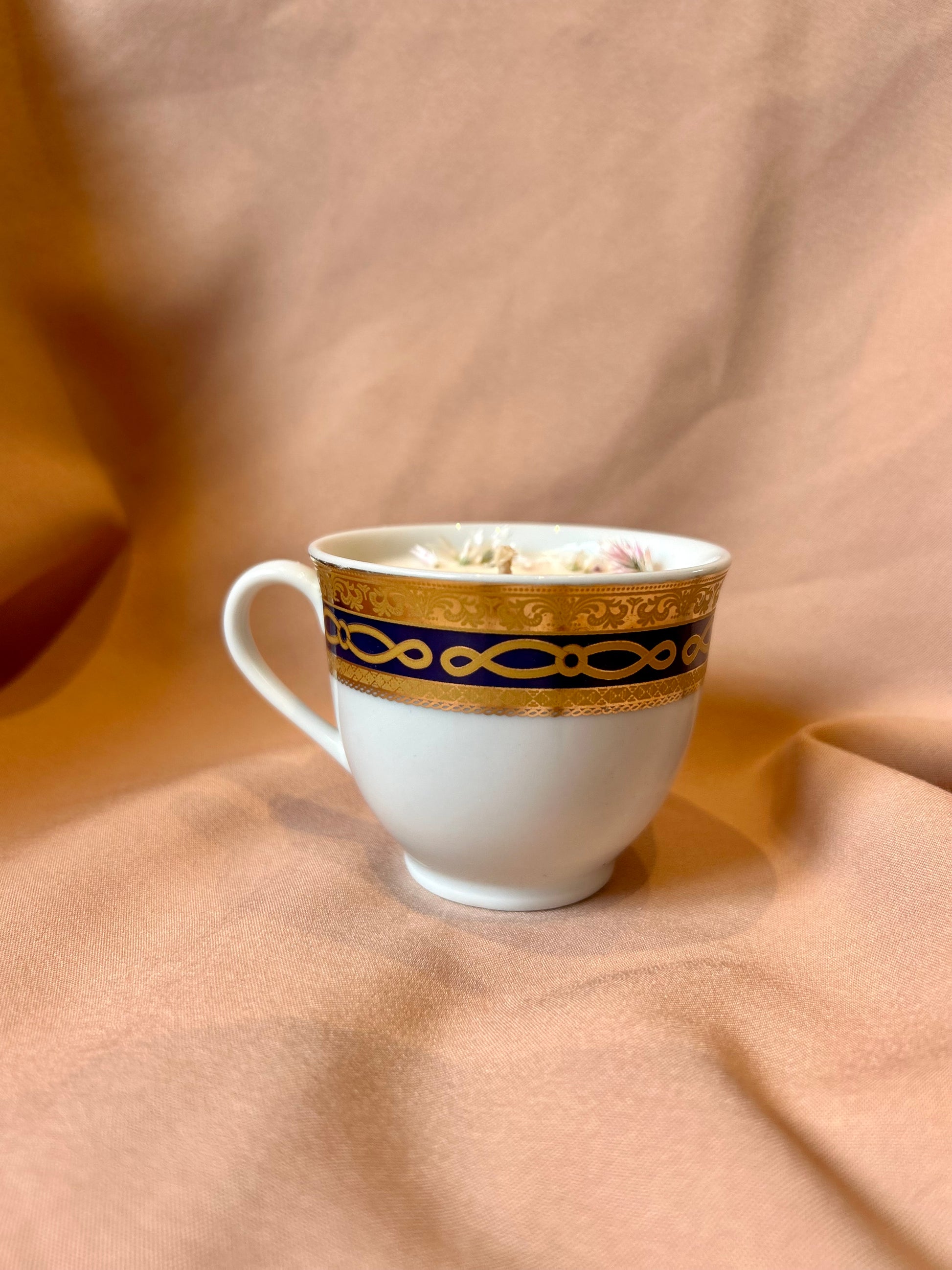 Faisons revivre cette jolie tasse avec des tons bleu marine et de la dorure.